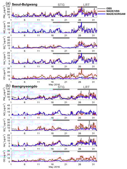 Time series of daily mean PM2.5 mass, and its chemical components, SO42−, NO3−, NH4+, and OC concentrations observed in (a) Seoul-Bulgwang and (b) Baengnyeongdo sites for May 2016 including two periods, stagnant (STG) and long-range transport (LRT) periods. Modeling results from two modules: MADE/VBS (red) and MADE/SORGAM (blue) were also denoted.