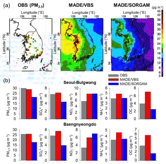 (a) Horizontal distributions of PM2.5 mass concentrations observed from 261 national sites, and two simulation results; (b) PM2.5 mass and 4 chemical components concentrations, SO4+, NO3−, NH4+, and OC, simulated from two modules, MADE/VBS and MADE/SORGAM, in South Korea.