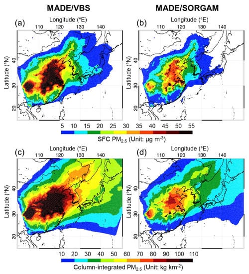 Comparisons of horizontal PM2.5 distributions of surface concentrations (a,b), and column-integrated concentrations (c,d) from two modules, MADE/VBS and MADE/SORGAM, respectively.