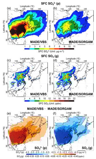 Comparisons of horizontal distributions for sulfate (a,b), SO2 gas concentrations (c,d), and differences (e,f) between two modules, MADE/VBS (left panel) and MADE/SORGAM (right panel), for sulfate (SO42−) and SO2, respectively.