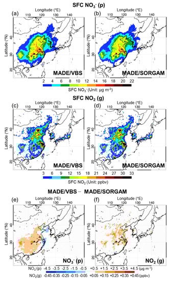 Comparisons of horizontal distributions for nitrate (a,b), NO2 gas concentrations (c,d), and differences (e,f) between two modules, MADE/VBS and MADE/SORGAM, for nitrate (NO3−) and NO2, respectively.