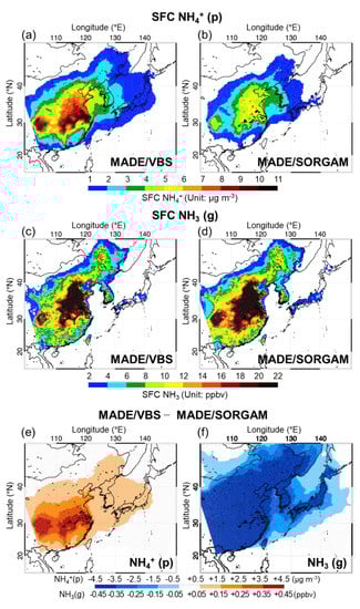 In the same manner, the NO3− distribution is also shown in Figure 7. Unlike sulfate and SO2, small discrepancies (<10%) in both nitrate and gas NO2 distributions can be seen between the two modules (see Figure 7a–d). It was confirmed that small fractions of discrepancies were found for both nitrate and gas-phase NO2 (Figure 6e,f). However, in the case of ammonium, as seen in Figure 8, a distribution pattern similar to sulfur (Figure 6) is demonstrated, characterized by a higher aerosol phase and lower gas concentration via M/V. Ammonia (NH3), a gaseous species, appeared to be almost the same (the discrepancies <10%) in both modules (Figure 8c,d), whereas particulate-phase ammonium simulated by M/S was slightly higher by less than 40% than that from M/V (Figure 8e). This implies that M/V has more positive particle generation, and therefore negative gas concentrations are lower than that from M/S, which means that in M/V the conversion of gas-phase to particle-phase occurs more frequently than in M/S; this phenomenon appears most evidently in central China.