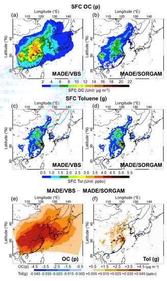 Comparisons of horizontal distributions for organic carbon (a,b), toluene gas concentrations (c,d), and differences (e,f) between two modules, MADE/VBS and MADE/SORGAM, for organic carbon (OC) and toluene, respectively.
