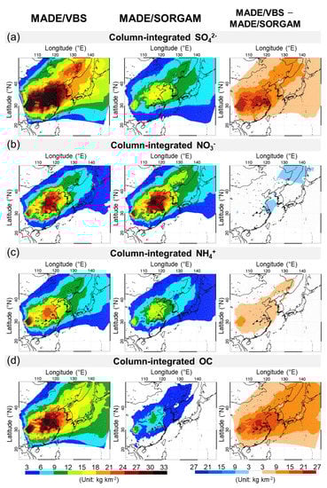 Column-integrated distributions of four chemical components, SO42−, NO3−, NH4+, and OC, simulated in two modules, and the discrepancies between them are shown in Figure 10. The results show that, again, the largest discrepancy between M/V and M/S is found for OC, with the domain-averaged OC by M/V simulated to be 370% higher, and the second largest discrepancy is found for SO42−, by 113%. However, NH4+ and NO3− showed small discrepancies, and NO3− showed a discrepancy with the opposite sign, i.e., M/S simulated values higher than M/V by a small amount (+19%), which is the only result that differs among the five integrated concentrations. The “column-integrated” values are found to exhibit similar behavior to that of the four “surface” chemical components between the two modules, as indicated in Figure 6, Figure 7, Figure 8 and Figure 9. Therefore, it can be concluded that the role of VBS module seems to be more significant for both surface- and column-integrated secondary aerosol concentrations and their biases caused by the different aerosol modules are greater than 79% in the mass fractions of PM2.5 mass concentrations and 370% in the second generation of OC, among the total SIA and SOA chemical components. This is mainly due to the M/V realistic treatment of the gas/aerosol system within a spectrum of VOC volatilities, using saturation vapor concentration, indicating again that M/V simulated clearly higher secondary PM2.5 concentrations via the photochemical process, relevant to SOA.