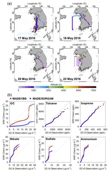 (a) NASA DC-8 flight pathways of 4 stagnant-dominant cases (17, 18, 20, and 22 May 2016) during the Korea-United States Air Quality (KORUS-AQ) campaign; (b) Quantile-Quantile plots for KORUS-AQ DC-8 aircraft PM1 measurements vs. WRF-Chem results for SO42−, NO3−, NH4+, and OC, simulated from two aerosol modules, MADE/VBS and MADE/SORGAM, respectively, over the stagnant-dominant period (16 May–21 May) during the KORUS-AQ campaign.