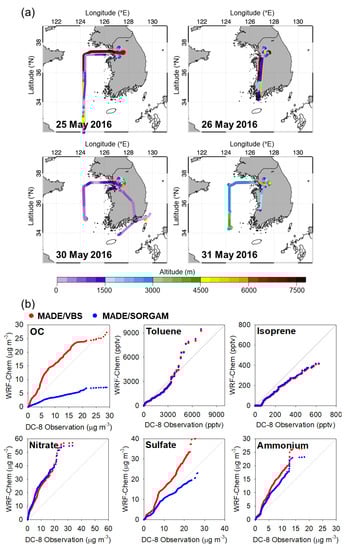 (a) NASA DC-8 flight pathways of 4 long-range transport dominant cases (25, 26, 30, and 31 May 2016) during the KORUS-AQ campaign; (b) Quantile-Quantile plots for KORUS-AQ DC-8 aircraft PM1 measurements vs. WRF-Chem results for SO42−, NO3−, NH4+, and OC, simulated from two aerosol modules, MADE/VBS and MADE/SORGAM, respectively, over the long-range transport dominant period (25–31 May) during the KORUS-AQ campaign.