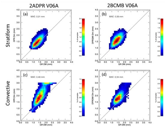A VN-based comparison of mass-weighted mean diameter (Dm) retrievals for the GPM core satellite and the GR for (a,b) stratiform and (c,d) convective precipitation for Version 06A of the (a,c) GPM/DPR Level 2 (2ADPR) and (b,d) Level 2B GPM Combined Radar–Radiometer Precipitation (2BCMB) GPM algorithms.