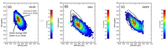 Convective rain drop size distribution (DSD) retrievals within the DPR matched scan (MS)/inner swath from (a) the GRs, and from DPR’s (b) 2AKu (single frequency), and (c) 2ADPR (dual frequency) Version 06A algorithms. The “+” and “X” in (a) are the average Dm and normalized intercept parameter (Nw) of the Global and convective DSDs, respectively, presented in Dolan et al. (2018). The contour lines in (b,c) mimic the pattern of the GR distribution in (a). The Nw used in log10 (Nw) is normalized by 1 m-3mm-1.