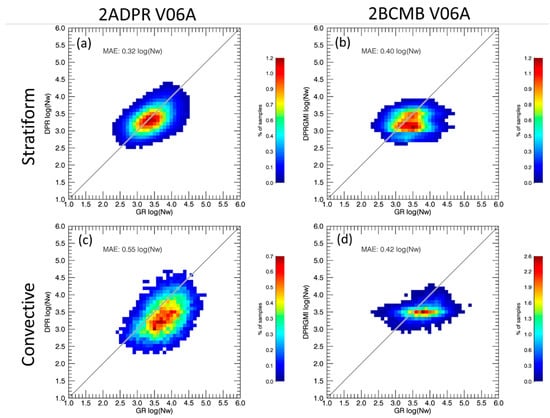 The retrievals of log10(Nw) from (left) 2ADPR and (right) 2BCMB relative to the GRs in (a,b) stratiform and (c,d) convective precipitation within the DPR inner (MS) swath.