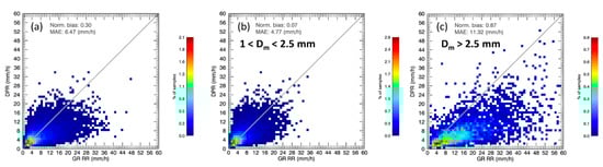 VN comparison of rainfall rate retrieved from 2ADPR within the outer swath scans of the DPR within (a) convective precipitation and convective precipitation (b) without large Dm and (c) with only large Dm.