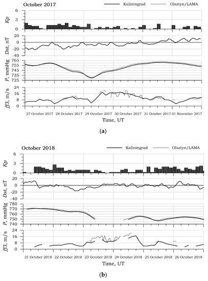 Variations in atmospheric pressure P, maximum wind gusts ff3, indices of geomagnetic activity Kp and Dst in Kaliningrad and Olsztyn during (a) 27 October–1 November 2017 and (b) 21–26 October 2018.