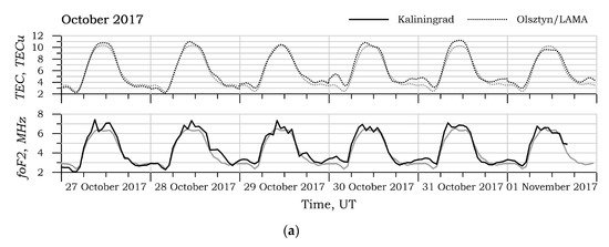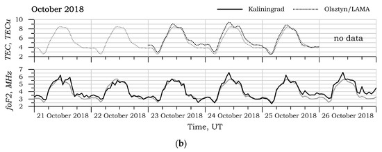 Total electronic content (TEC) and critical frequency of the F2 layer (foF2) measurements in Kaliningrad and Olsztyn (a) from 27 October to 1 November 2017; (b) 21–26 October 2018. The gray lines indicate the median values of TEC and foF2.