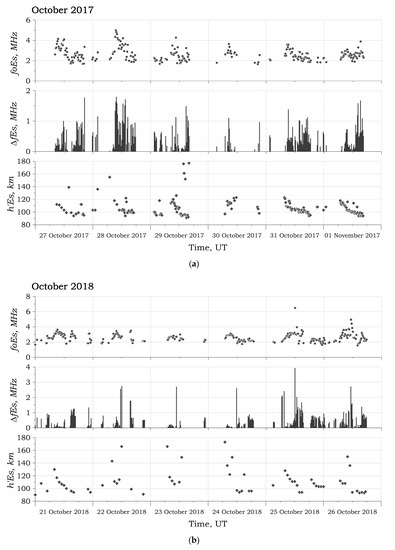 In October 2017, the meteorological storm began at 06 UT on 29 October and lasted until 23:00 UT (Figure 3a). A rapid decrease in the critical frequency Es of the layer was noted after 12:00 UT. From 17:00 UT on 29 October till 06:00 UT on 30 October and from 14:00 UT on 30 October till 07:00 UT on 31 October, the critical frequency foEs decreased below the ionosonde sensitivity threshold (~2 MHz).