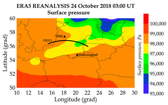 In the analysis of the observations of signals from individual GPS satellites, TEC variations were distinguished with periods of no more than 30 min, which corresponded to the periods of AGW and IGW, which, as shown above, propagated almost vertically from the meteorological storm area to the heights of the upper atmosphere. Figure 4 shows the trajectory of the PRN3 satellite over the VIS0 station on the latitude-longitude map of surface pressure on 24 October 2018, according to the ERA5 reanalysis data [91]. The threshold value of the elevation angle for the analysis of the ionospheric response was determined to be no more than 30˚. The satellite flyby was chosen as close as possible to the VIS0 receiving station. As can be seen from the figure, on 24 October 2018, the area of reduced pressure was located to the north of Kaliningrad.