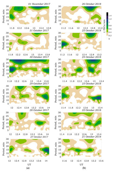 Figure 5 shows the wavelet periodograms of the TEC variations over the VIS0 station from 27 October–1 November 2017 and 21–26 October 2018, which were obtained from the PRN 3 satellite signal observations. To calculate the wavelet periodograms of the TEC variations, the day-to-day data from a single GPS satellite was used to demonstrate the variability of AGW activity in the ionosphere during periods of meteorological activity. The GPS satellites orbited in an almost circular way, which allowed us to consider changes in spectral characteristics at the same time on different days. This consideration made it possible to exclude the influence of the regular sources on the ionosphere. The satellite flyby was recorded in the daytime (about noon), which allowed us to eliminate the effects of the solar terminator on the Earth’s ionosphere. There were a large number of AGW sources in the lower atmosphere, so the presence of such waves was observed daily. However, as follows from Figure 5, during the periods of meteorological disturbances on 29–30 October 2017 and 23–24 October 2018, there was an increase in the intensity of variation with periods of 10–16 min.