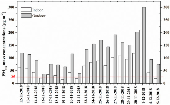 Figure 2 shows the time series of indoor and outdoor PM2.5 mass concentrations during the entire observation period. The variations of indoor and outdoor PM2.5 concentrations were similar with wide range of fluctuations (i.e., from 37 µg m−3 to more than 300 µg m−3 in the outdoor environment, while from 15 µg m−3 to 211 µg m−3 in the indoor environment). The daily average concentrations of all outdoor samples and 80% of the indoor samples exceeded the WHO-established 24-h standard of 25 µg m−3 for PM2.5 [54], which implies that PM2.5 pollution in both indoor and outdoor environments in Jinan is severe.