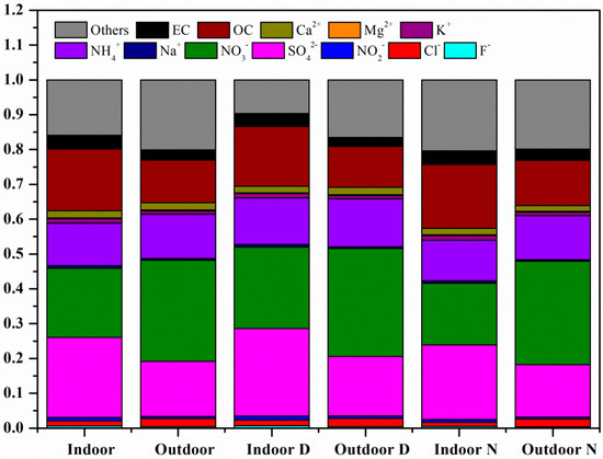 Table 1 summarizes the statistics (including daily, daytime, and nighttime mean values) of indoor and outdoor PM2.5 and its major chemical components. In general, the concentrations of indoor PM2.5 and its major chemical components were always lower than those of the outdoor counterparts (Figure 2 and Table 1). The mean outdoor and indoor PM2.5 concentrations were 69.0 ± 50.5 µg m−3 and 128.7 ± 67.9 µg m−3, respectively. In a highly polluted urban area such as Jinan, indoor PM2.5 was approximately 50% of the outdoor PM2.5 and therefore indoor had slightly better air quality. This holds for an unoccupied, unused office that has closed the door and windows and is probably determined by outdoor air leaking into the building. Compared with the findings of previous studies in urban Jinan [24,26], both indoor and outdoor concentrations in this study were lower, suggesting alleviation of PM2.5 pollution. Water-soluble ions were the most abundant species. The total concentrations of water-soluble ions (F, Cl, NO2, NO3, SO42−, Na+, NH4+, K+, Mg2+, and Ca2+) in outdoor and indoor environments were 75.23 ± 35.35 µg m−3 and 41.71 ± 20.79 µg m−3, respectively (with ranges of 20–177 µg m−3 and 13–113 µg m−3, respectively), accounting for 60% and 62% of the outdoor and indoor PM2.5 concentrations, respectively. Among these water-soluble ions, SO42−, NO3, and NH4+ were predominant, whereas other ions (F, Cl, NO2, K+, Na+, Mg2+, and Ca2+) were normally observed at very low concentrations in both the indoor and outdoor PM2.5 samples. The concentrations of predominant water-soluble ions followed the order of SO42− > NO3 > NH4+ in indoor PM2.5 and NO3 > SO42− > NH4+ in outdoor PM2.5. In addition, OC and EC constituted important fractions of the PM2.5 concentration, with average concentrations of 11.46 ± 5.62 µg m−3 and 2.53 ± 1.06 µg m−3 in the indoor environment, respectively, and 14.88 ± 7.80 µg m−3 and 3.53 ± 1.56 µg m−3 in the outdoor environment, respectively.