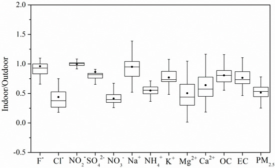 The indoor/outdoor ratio (I/O ratio) is calculated as Cin/Cout [37], where Cin and Cout are the indoor and outdoor species concentrations, respectively. Figure 4 shows I/O ratios of PM2.5 and its chemical components. The average I/O ratios of PM2.5 and its chemical components were all lower than 1.0, indicating that the indoor PM2.5 concentration was strongly affected by outdoor pollution. The I/O ratios of SO42− and OC were the highest, both of which were 0.81 (SO42− range: 0.65–1.05, OC range: 0.55–1.16), whereas that of NO3 (0.41 ± 0.10) was lower, as also observed by previous studies [24,26]. The decomposition of ammonium nitrate and other volatile components due to higher indoor temperatures led to a reduction in the PM2.5 I/O ratio.