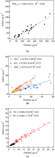 Figure 5. Linear regression between indoor and outdoor: (a) PM2.5; (b) SO42−, NO3, and NH4+; (c) OC and EC.
