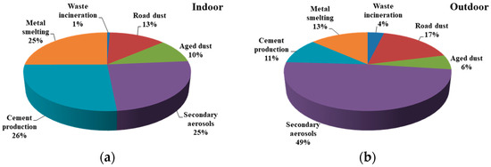 Factor 6 was suggested to be associated mainly with coal combustion [60,61], because it was characterized by the high loadings of As, Se, Zn, OC, and EC and contributed 59%, 43%, 41%, 42%, and 39% to the total As, Se, Zn, OC, and EC concentrations, respectively. Coal is still a primary energy source in Shandong Province, particularly during the heating season, with As, Se, Pb, Cr, Mn, Cu, and Zn as representative element tracers [62]. This factor also contained large contributions from Mn, Cu, and Pb and was associated with metal smelting [65]. This factor contributed 13% and 25% to the outdoor and indoor PM2.5 concentrations, respectively (Figure 7).
