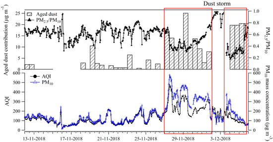 Figure 8. Time series of PM10, PM2.5/PM10, AQI, and aged dust contribution to PM2.5 obtained by PMF.