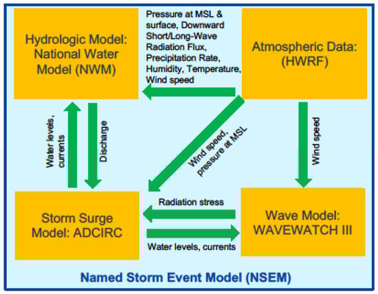 The design of the Named Storm Event Model (NSEM) framework (pre-decisional). The NSEM includes the ADvanced CIRCulation (ADCIRC; [6]) model as the hydrodynamic component, the WAVEWATCH III (WW3; [7,8]) as the wave model, the Hurricane Weather Research Forecast (HWRF) model as the atmospheric component, and, in the future, the National Water Model (NWM) as the inland hydrological component. “Atmospheric Data” indicates that the atmospheric forcing fields are provided by the hurricane simulation with the HWRF model [3].