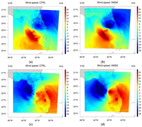 A comparison of 10 m U and V components of wind speed with/without the high-resolution land–sea masks within the innermost domain (d03) for Hurricane Irma (2017) at 0000 UTC, September 11, 2017. (a,c) U10 and V10 with the coarse resolution (13.5 km) of land–sea masks in the FY18 HWRF; (b,d) U10 and V10 with the high resolution (1.5 km) of land–sea masks.