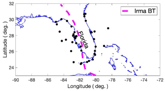 National Data Buoy Center (NDBC) observations near Hurricane Irma’s landfall, used for HWRF validation, are indicated by black dots. Magenta depicts Hurricane Irma’s best track.