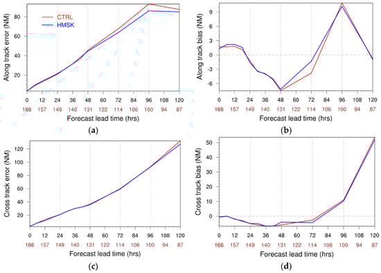 The along- and cross-track biases shown in Figure 9b,d were further examined for hurricane track forecasts, as well. The along-track forecast bias is a component of the total-track forecast bias and can be used as a measure of whether the forecast is fast or slow. Along-track biases from two experiments have a similar pattern: negative between the 24 and 72 h forecast period, suggesting slower moving speeds along the best track direction, and positive after the 72-h forecast, suggesting faster moving speeds along the best track direction. However, the results show the along-track forecast from the HMSK is closer to the best track than that of CTRL, especially after 48 h. The cross-track forecast bias is another component of the total-track forecast bias and can be used as a measure of how far the forecast is to the left or right of the verifying position. Figure 9d shows that HMSK, with the high-resolution land–sea mask, is close to the best track moving direction, especially in the forecast period between 48 and 96 h.