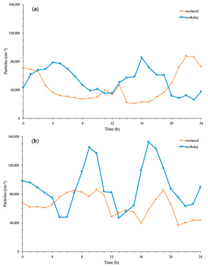 Figure 3 shows typical daily behaviors of particle number concentration levels in the range 18–750 nm during workdays (from Monday to Friday) and weekends (Saturday and Sunday) in October (Figure 3a) and December (Figure 3b).