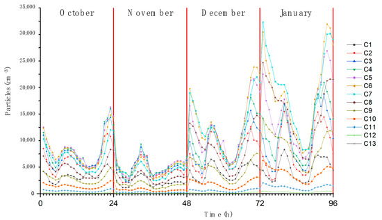 Daily behavior of the different fraction sizes in the range 18–750 nm over the whole investigated period (C1: 17.8 nm; C2: 23.7 nm; C3: 31.6 nm; C4: 42.2 nm; C5: 56.2 nm; C6: 75.0 nm; C7: 100.0 nm; C8: 133.4 nm; C9: 177.8 nm; C10: 237.1 nm; C11: 316.2 nm; C12: 422.7 nm; C13: 562.2 nm).