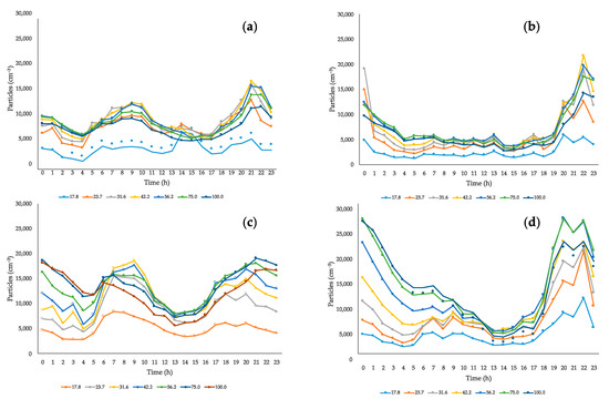The anthropogenic source contribution can be better highlighted by analyzing the behavior of the single size fractions. Figure 5 shows the daily UFP profiles during the workday and weekend in October (Figure 5a,b, respectively) and December (Figure 5c,d, respectively). The profiles are different, both qualitatively and quantitatively. In October, the hourly workday trend is characterized by low levels during the nighttime, specifically below 10,000 cm−3/hour between midnight and 5 a.m. for each fraction when the boundary layer is lower as well as the traffic, and two peaks during the daylight. Each fraction ranges between 5000 and 15,000 cm−3/hour in the morning, i.e., when the boundary layer goes up and atmospheric stability conditions are established with high emissions of anthropogenic sources.