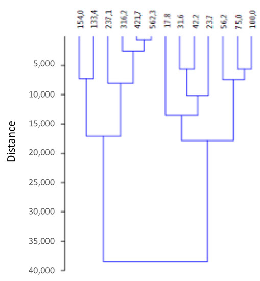 On the other hand, CA applied to overall the data was performed to understand what fraction size was mainly relevant for the whole period; Figure 6 shows the dendrogram related to this analysis. The data are grouped into two different clusters: cluster #1 is formed by size fractions below 100.0 nm, i.e., Ultrafine Particles (UFPs), whereas cluster #2 is formed by the fraction above 100.0 nm. This is another confirmation of the importance of the generation processes that take place in large urban areas [44].