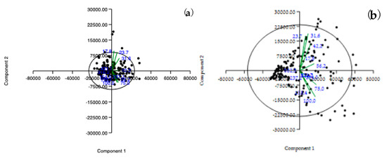 Figure 7 shows the Principal Component Analysis (PCA) applied to two typical weeks in October (a) and December (b), affected by different anthropogenic sources. A different distribution of the data can be detected. In Figure 7a, the 95% confidence ellipse is narrower than the same reported in Figure 7b, highlighting a similar source for all the particles. Furthermore, it is still confirmed that the particles in the range between 17.8 and 42.2 nm are highly correlated with Component #2, whereas particles above 42.2 nm are anti-correlated with Component #2. The data reported in Figure 7b, i.e., for a typical week in December, show a large variance due to the presence of different anthropogenic sources involved in the particle formation. In fact, first should be considered the high presence of vehicles equipped with diesel engines, specifically buses, trucks and coaches, which are a strong component in Rome [31]. On the other hand, in this period, there is also the domestic heating that uses different biomass combustion with different relative burning emissions [45,46,47,48,49,50].