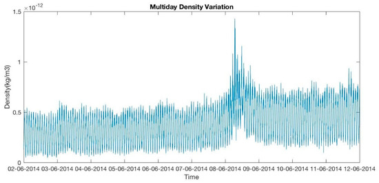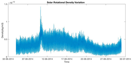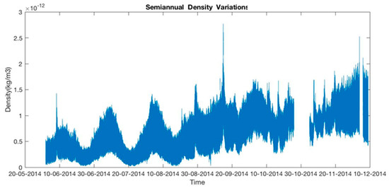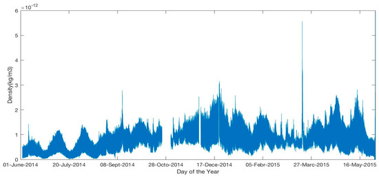 Figure 5 and Figure 6 show the semi–annual and annual density variation in the upper thermosphere from 2nd June 2014. In September, we can see only a local peak, the seasonal maximum is observed in December–January, whereas the lowest is seen from May to August. The other peak is seen in March 2015. St Patrick’s Day is on 17 March and a storm occurred on that particular date. The density variations follow the “V” shape for the first 2–3 months due to the 27–day solar rotational period and recurrent geomagnetic forcing. Thermospheric density strongly varies seasonally where the large dispersion is detected near the equinoxes whereas the minimum is recorded at the time of northern and southern hemisphere summer. Several researchers have detected the annual density variation. Bowman et al. [5,6] found this variation under high solar activity conditions and the impact of solar indices. Emmert and Picone [16] found the variation due to the F10.7 index and the Kp geomagnetic activity index. Qian and Solomon [12] detected this variation due to eddy mixing comprised by breaking the gravity waves on the mesosphere and lower thermosphere zonal mean winds, which can modify the thermosphere neutral composition.