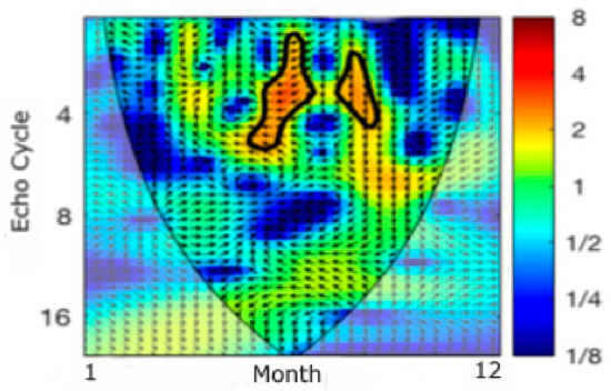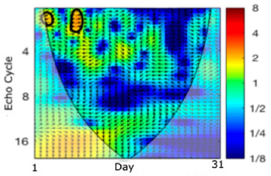 The scalogram analysis is shown again in Figure 7 but considering a year where we can see a significant echo cycle near 3–4 months. This can happen because of missing data that were interpolated.