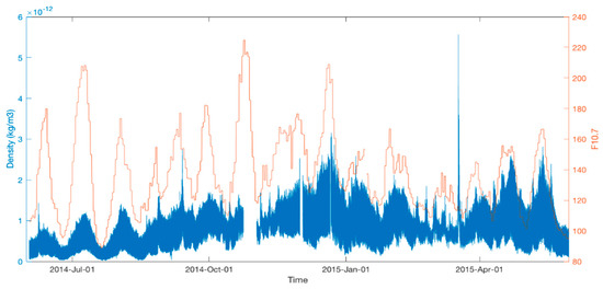 Density and F10.7 variations over a year. Blue and orange colors represent density and F10.7. F10.7 is presented in the so–called solar flux units, sfu, equal to 10−22 W/(m2∙Hz).