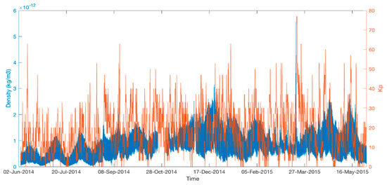 To build an accurate representation of the atmospheric density, reliable data have been obtained through the Swarm mission from the accelerometers. In this study, the daily density data have been collected from the Swarm–C satellite (from June 2014 to May 2015). Swarm Level 1b (L1b) and Level 2 (L2) data products are freely available by FTP to ESA–EO registered users (https://earth.esa.int/web/guest/Swarm/data–access). The FTP top–level structure is divided into the ‘Level1b’, ‘Level2daily’, and ‘L2longterm’ directories. The Swarm Level 1b data products are then corrected and the output is formatted (3 days after downlink) from each of the three Swarm satellites. By complex assimilation of these individual satellite measurements into one set of products for the satellite constellation, the Swarm Level 2 processor ensures a very significant improvement of the quality of the final scientific data products (up to three weeks later). The F10.7 and Kp data have been collected from http://www.swpc.noaa.gov/Data/index.html. This is mostly used by atmospheric models and a vital step to determine the accuracy of any atmospheric model [21,22,23,24,25,26,27,28].