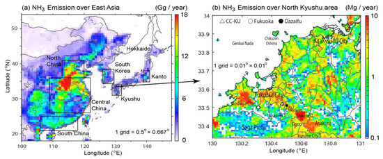 Horizontal distribution of NH3 emission by (a) REAS over East Asia used for GEOS-Chem simulation (Grid = 0.5° × 0.667°) and (b) EAGrid over the North Kyushu area (Grid = 0.01° × 0.01°).