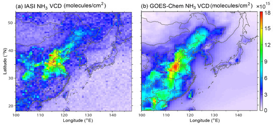 Over the last few years, satellite instruments capable of detecting NH3 vertical column density (VCD) have been used to study the emission, distribution, and transport of NH3 at global and regional scales [15,16,17]. Via comparison of satellite retrievals and simulations using a global atmospheric chemistry transport model, it was indicated that NH3 emissions could have been significantly underestimated in the Northern Hemisphere [15]. Also, based on five-year satellite retrievals, the seasonality and interannual variability were examined separately for the Northern and Southern Hemispheres [16]. Via comparison between satellite retrievals and LOTOS-EUROS model results over Europe and Western Russia, large discrepancies were found over several industrial areas in Eastern Europe and Russia [17]. Since the satellite retrievals may suffer large relative errors, especially in areas with low VCD, detailed evaluations are necessary, especially over East Asia where the studies are limited.