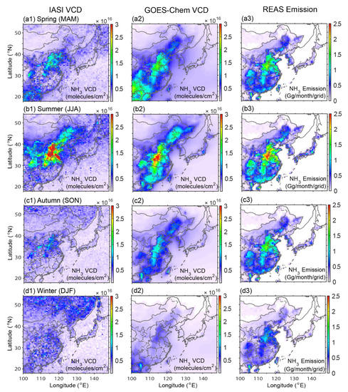 Figure 3 showed the averaged IASI retrieved and GEOS-Chem simulated NH3 VCDs as well as REAS NH3 emission over East Asia in the spring (March–April–May, i.e., MAM), summer (June–July–August, i.e., JJA), autumn (September–October–November, i.e., SON), and winter (December–January–February, i.e., DJF). The horizontal distributions of the IASI and GEOS-Chem NH3 VCDs were generally similar in the different seasons, with high values over North and central China. However, the GEOS-Chem results revealed that the areas downwind of China (e.g., the East China Sea and Japan sea areas) had a higher NH3 VCD in spring than in summer, even though the NH3 VCD over China was significantly higher in summer than in spring. This indicated the importance of long-range transport of NH3 over East Asia in the cold season when northwest winds were dominant.
