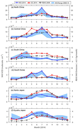 Regional averaged monthly IASI NH3 VCD (the blue dashed line with open circle and shade), GEOS-Chem NH3 VCD (the red dashed line with the open triangle), and REAS NH3 emissions (the black dashed line with the open triangle). (a): North China, (b): Central China, (c) South China, (d) South Korea, (e) Kanto Japan, (f) Kyushu Japan.