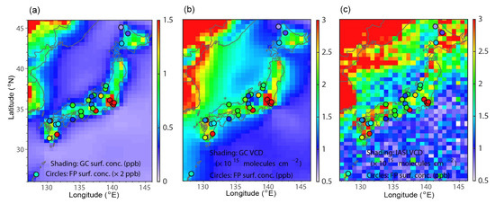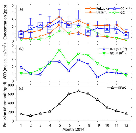 Figure 9a shows FP data for Fukuoka and Dazaifu for 2014 and a box-whisker plot of NH3 measurements at CC-KU (monthly data for January–July 2015, and August–December 2014 was used to show the seasonal cycle). Figure 9b,c show a comparison of IASI and GEOS-Chem NH3 VCDs over Fukuoka and REAS NH3 emissions used for GEOS-Chem simulations, respectively (the horizontal resolution of the REAS emission inventory was approximately 50 km; therefore, the three sites could not be distinguished). The FP NH3 levels were highest at Dazaifu (S27), which was slightly higher than CC-KU and was 2–3 times higher than Fukuoka (S26). This indicated that differences in local NH3 emissions surrounding the observation site can significantly affect the observed NH3 concentrations, although the three measurement sites were located in the same GEOS-Chem grid. Therefore, higher resolution simulations were necessary to reproduce the horizontal distributions of NH3 in urban areas.