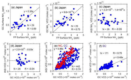 Figure 5 shows the annual averaged FP NH3 data over Japan and a comparison with IASI NH3 and GEOS-Chem NH3 VCDs. Figure 6 shows a scatter plot of (a) FP and GEOS-Chem surface NH3, (b) FP surface NH3 and GEOS-Chem NH3 VCD, (c) FP surface NH3 and IASI NH3 VCD and (d) IASI and GEOS-Chem NH3 VCDs over Japan in 2014. Figure 6 also shows a comparison of IASI and GEOS-Chem NH3 VCDs over (e) North and central China, and (f) South China.