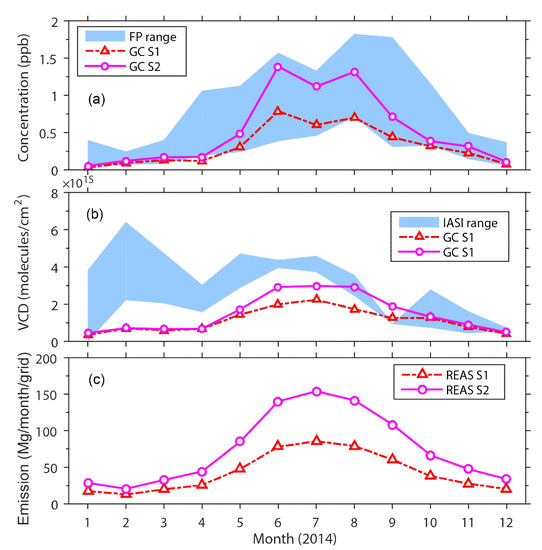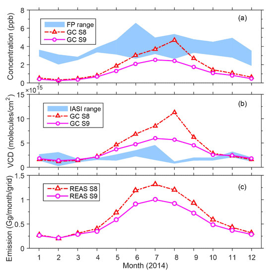 Figure 8 shows similar information for the Kanto area. FP data for various sites (S8, S9, S10, and S13 for 2014) are shown in the shaded area, and these 4 sites are located in 2 grids in GEOS-Chem; therefore, only GC S8 and GC S9 are shown in Figure 8. The FP average was higher than the GEOS-Chem average (i.e., GEOS-Chem was underestimated), but both displayed a clear summer peak (seasonal cycle). Both FP and GEOS-Chem data showed a peak in August, but IASI data did not show a peak at the same time, and the peak of REAS emission was July. The IASI results in August indicated very low levels and did not show a significant summer maximum, which may also be due to a large relative error.