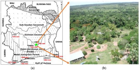 (a) Localization map of the Lamto-Côte d’Ivoire region (6°31′ N–5°02′ W). Green point indicates Lamto location; Numbers in red are the mean annual precipitation (1962–1997) of some synoptic stations and from north to south are located the types of vegetation (From Tiemoko et al. [36]). (b) Zoom on the vegetation of Lamto.