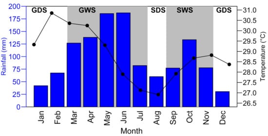 Precipitation–temperature diagram over 2014–2017. GDS, GWS, SDS, and SWS are respectively the Great Dry Season, the Great Wet Season, the Short Dry Season and the Short-Wet Season.