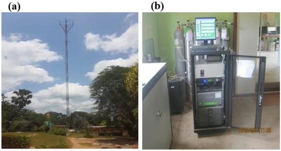 Photo (a) of the 50 m high tower and (b) of the measurement system “PICARRO G2401”.