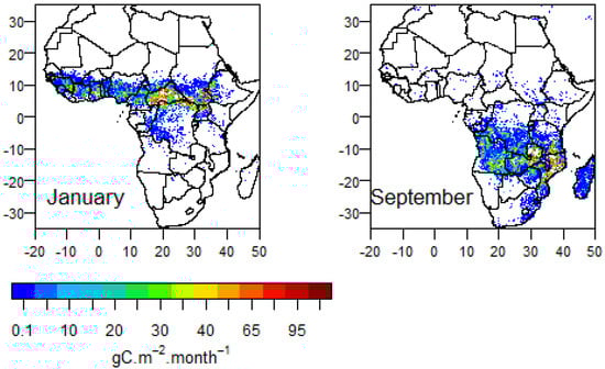 The CO2, CH4, and CO continuous measurement data of LTO are times series from August 2008 to May 2018 for both CO2 and CH4, and from March 2014 to May 2018 for CO concentrations. Here we focus only on the 2014–2017 period where measurements of CH4, CO2, and CO are available. Continuous measurements were made from CRDS (cavity ring-down spectroscopy) analyzers with model G2401 (Figure 3b) [37,38,39]. The air analyzed is taken continuously at the top of a 50 m tower (Figure 3a). The measuring system, data processing, and calibration strategy are explained by Tiemoko et al. [20]. CO2, CH4, and CO measurement data presented here were calibrated using gases measured by the Laboratoire des Sciences du Climat et de l’Environnement (LSCE/IPSL) in Gif-sur-Yvette, France and are traceable to World Meteorological Organization (WMO) scales (CO2: WMO X2007; CH4: WMO X2004A; CO: WMO X2014A) [6]. The quality control process (regular measurement of a target gas) indicates precisions below 0.1 ppm, 0.5 ppb, and 16 ppb for CO2, CH4, and CO measurements respectively (see [20]). In addition, the species CO2, CH4, and CO have been the subject of many studies [40,41] to establish the emission maps. As an illustration, the emission maps based on GFEDS data are shown in Figure 4. The months of January and September selected here correspond to the fire regimes in the equatorial and southern part of Africa, respectively. It has been observed that during these periods of the year significant amounts of carbon are emitted by fires. Fires are the main source of carbon emissions in Africa, accounting for 50% of global carbon emissions from fire burning.