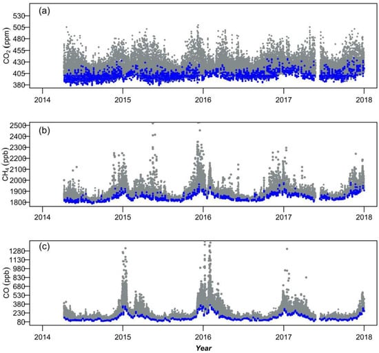 Time-series of atmospheric CO2 (a), CH4 (b), and CO (c) concentrations (in black) measured at the LTO station over the 2014–2017 period. The blue color represents the background obtained by the percentile method.